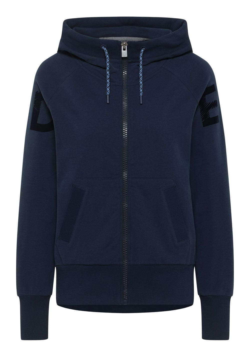 gestickt Ösen, gemusterte Kordel, weicher Flockprint über Ärmel & Rücken, Logo Badge an Seitennaht
